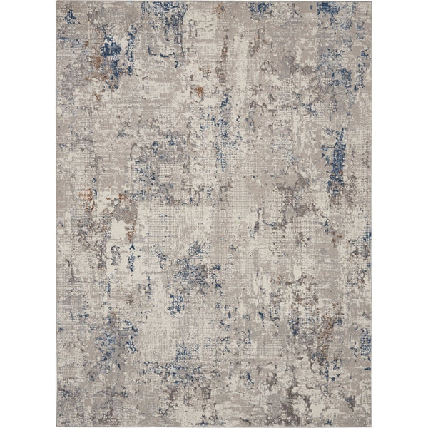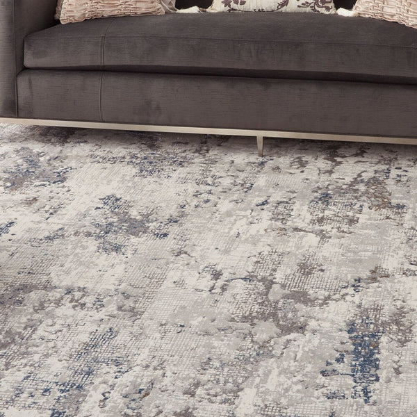 An abstract pattern with brush strokes adds intrigue to this modern Home rug. White and grey fibers form a neutral base with gentle pops of blue and flecks of gold. Borderless design and a hint of sheen give it a contemporary feel that will work well in almost any room.