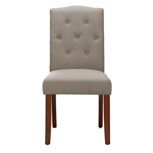 Updating your dining or living area has never been easier than with the Taupe Faux Linen Dining Chair. This chair is very easy to assemble, leaving you stress-free and with a little extra time on your hands. The quality of the chair is noticeable in all of its details. The decorative stitching and the hand-sewn buttons are tasteful, as seen in the traditional diamond pattern button-tufting. The silhouette of the chair, namely the soft camelback design, is classic and elegant. The calming taupe faux linen used on the dining chair coordinates perfectly with the dark espresso solid wood legs. The comfort factor and durability of this chair was considered as well. The chair is based on a solid wood frame to ensure years of use. High density foam is used in the seat and back areas for added comfort. Use the Taupe Faux Linen Dining Chair to create extra seating or as an accent chair throughout your home.
